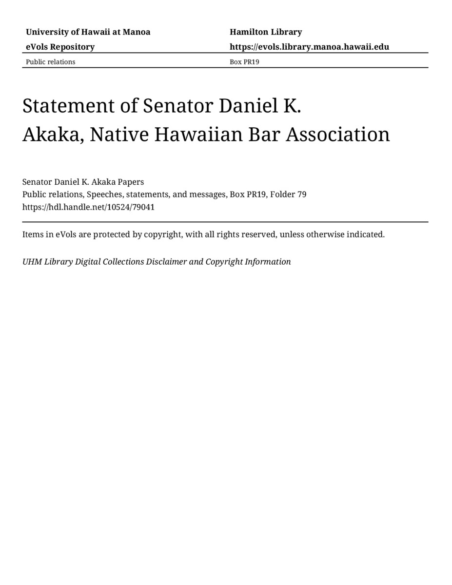- Statement of Senator Daniel K. Akaka, Native Hawaiian Bar Association