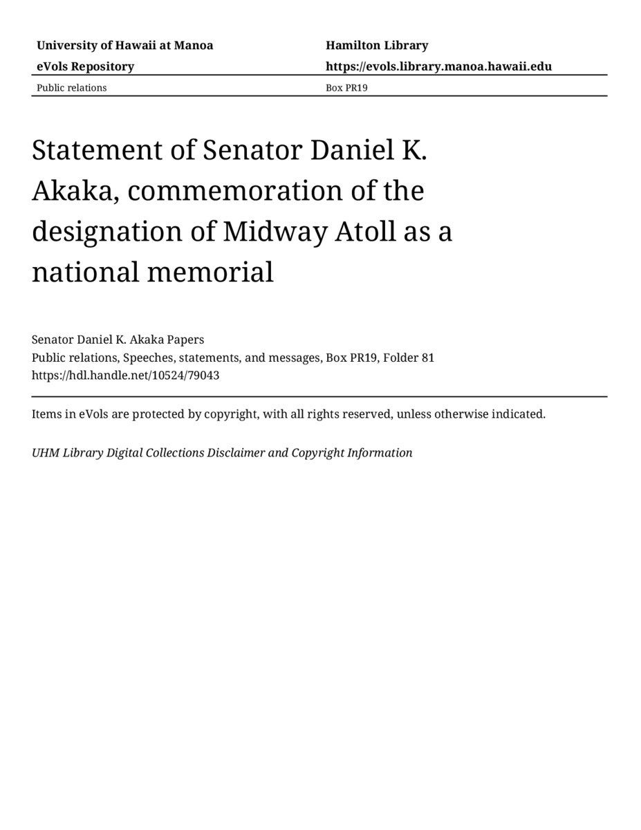 - Statement of Senator Daniel K. Akaka, commemoration of the designation of Midway Atoll as a national memorial