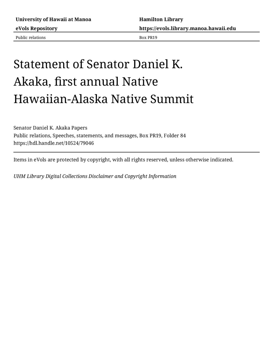 - Statement of Senator Daniel K. Akaka, first annual Native Hawaiian-Alaska Native Summit