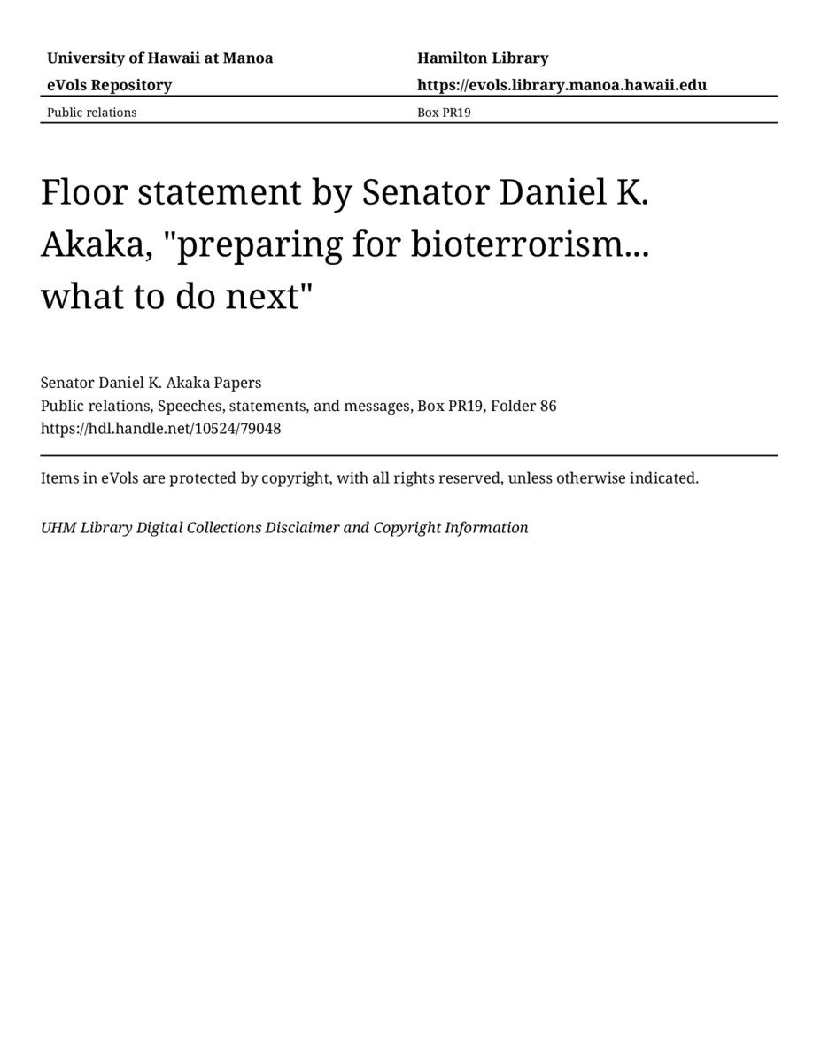 - Floor statement by Senator Daniel K. Akaka, "preparing for bioterrorism... what to do next"