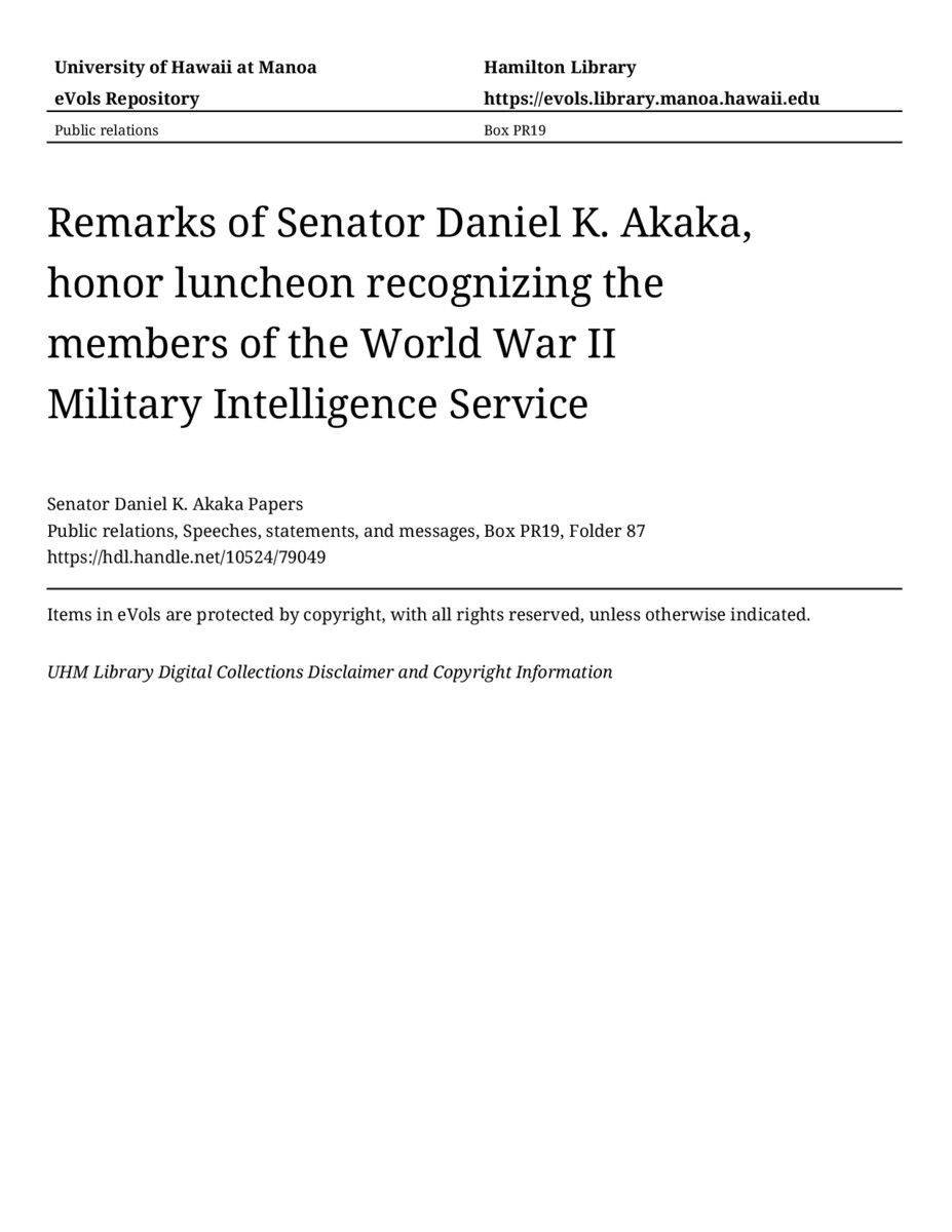 Remarks of Senator Daniel K. Akaka, honor luncheon recognizing the members of the World War II Military Intelligence Service, August 11, 2001, MANUSCRIPT-HCPC00010, Public relations, Speeches, statements, and messages, Box PR19, Folder 87, Senator Daniel K. Akaka Papers, Hawaiʻi Congressional Papers Collection, University of Hawaiʻi at Mānoa Library, Honolulu, HI. https://congressarchives.org/catalog/10524_79049 (accessed March 20, 2026).