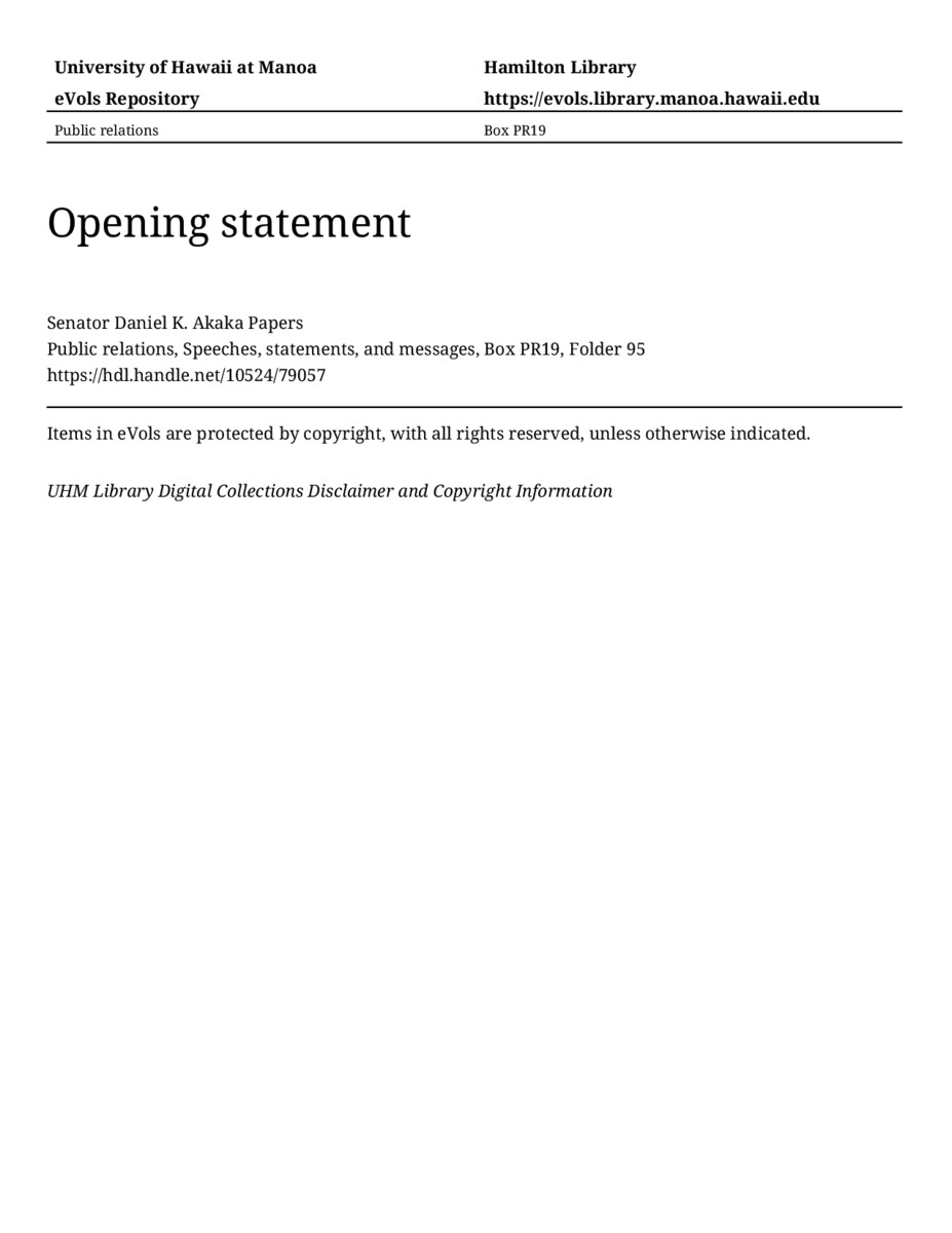 Opening statement, October 17, 2001, MANUSCRIPT-HCPC00010, Public relations, Speeches, statements, and messages, Box PR19, Folder 95, Senator Daniel K. Akaka Papers, Hawaiʻi Congressional Papers Collection, University of Hawaiʻi at Mānoa Library, Honolulu, HI. https://congressarchives.org/catalog/10524_79057 (accessed March 18, 2026).