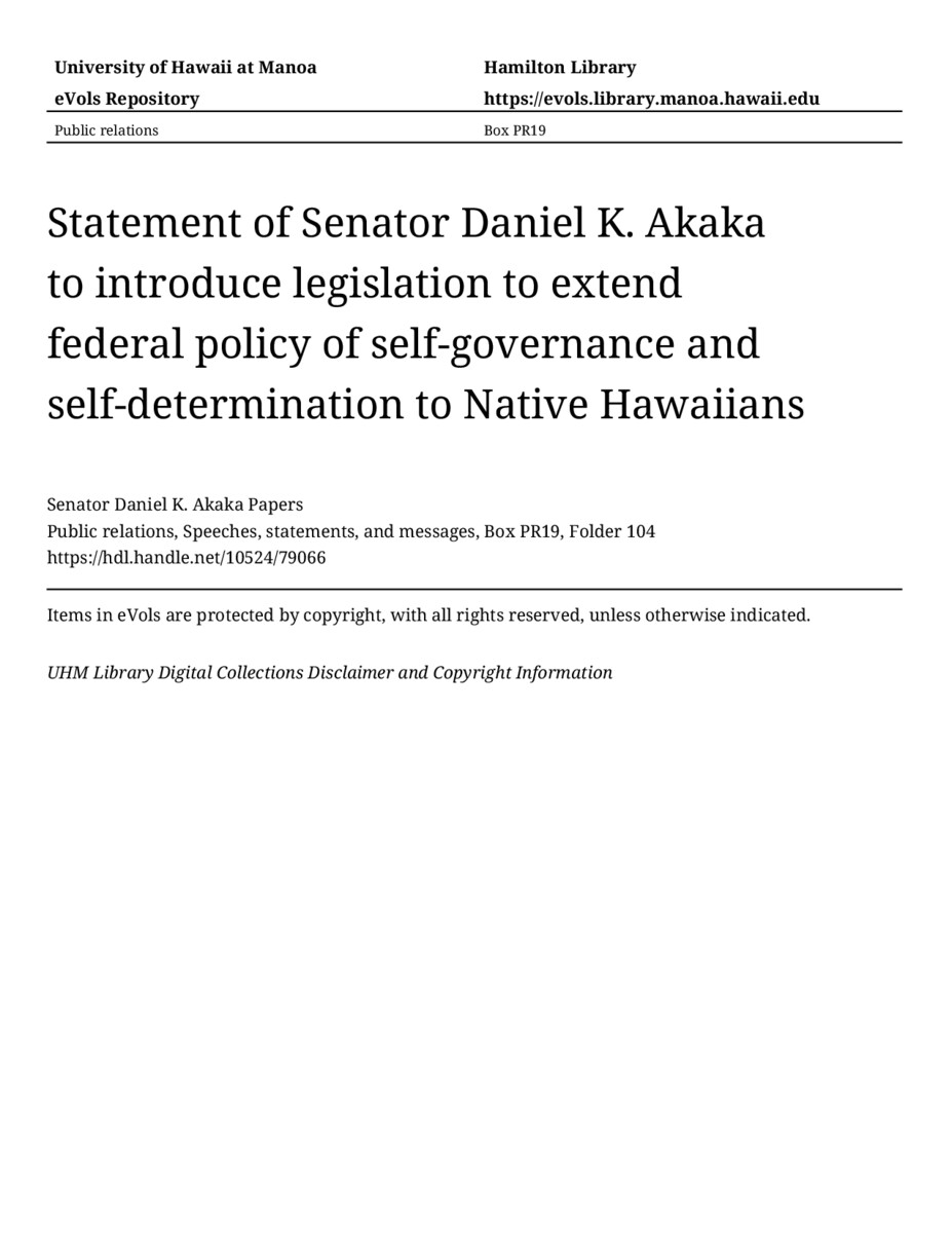 Statement of Senator Daniel K. Akaka to introduce legislation to extend federal policy of self-governance and self-determination to Native Hawaiians, February 6, 2003, MANUSCRIPT-HCPC00010, Public relations, Speeches, statements, and messages, Box PR19, Folder 104, Senator Daniel K. Akaka Papers, Hawaiʻi Congressional Papers Collection, University of Hawaiʻi at Mānoa Library, Honolulu, HI. https://congressarchives.org/catalog/10524_79066 (accessed March 19, 2026).