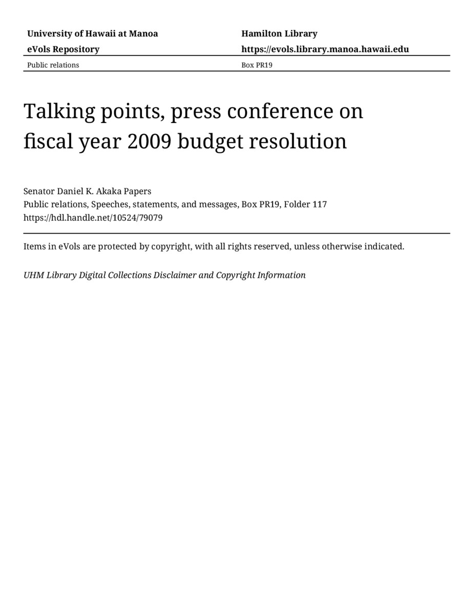 - Talking points, press conference on fiscal year 2009 budget resolution