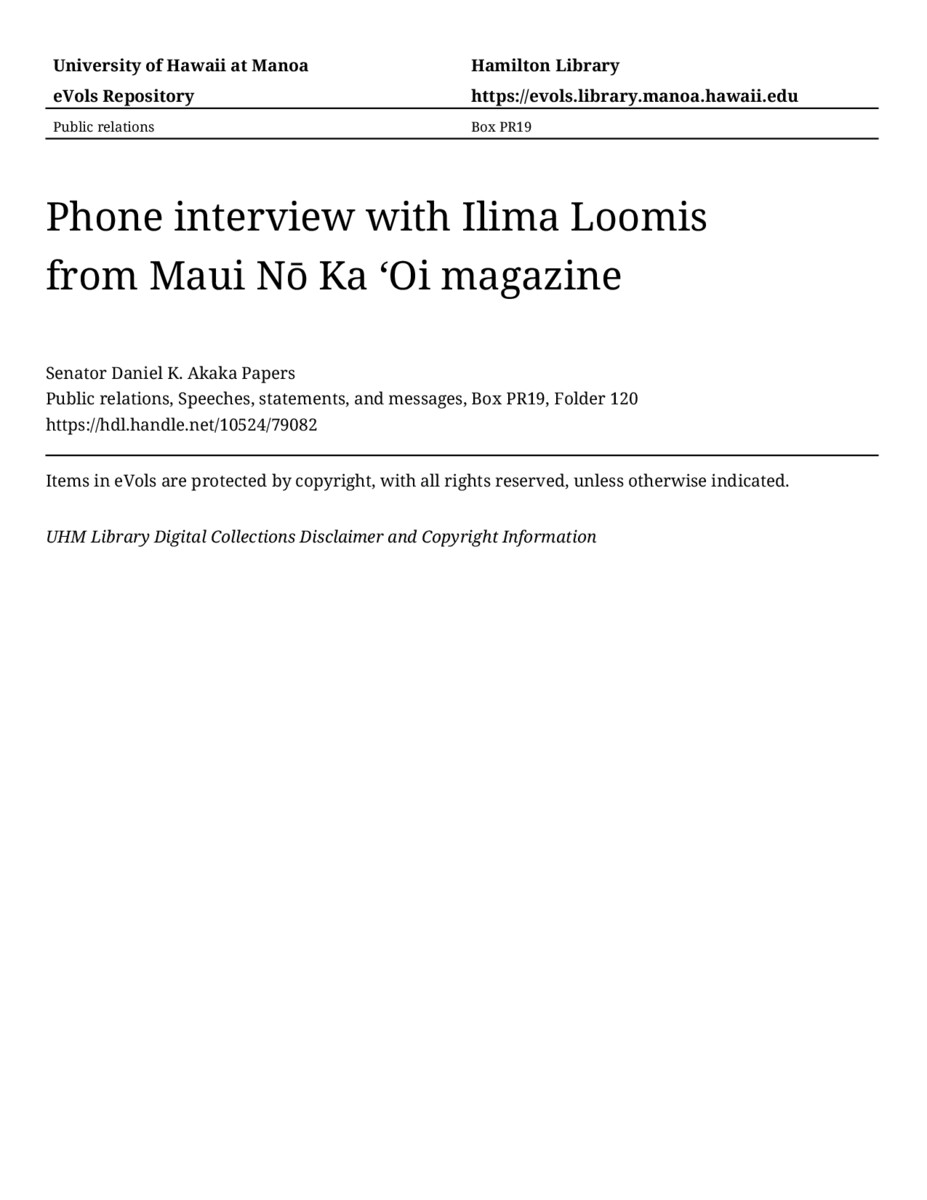 Phone interview with Ilima Loomis from Maui Nō Ka ʻOi magazine, March 26, 2009, MANUSCRIPT-HCPC00010, Public relations, Speeches, statements, and messages, Box PR19, Folder 120, Senator Daniel K. Akaka Papers, Hawaiʻi Congressional Papers Collection, University of Hawaiʻi at Mānoa Library, Honolulu, HI. https://congressarchives.org/catalog/10524_79082 (accessed March 19, 2026).