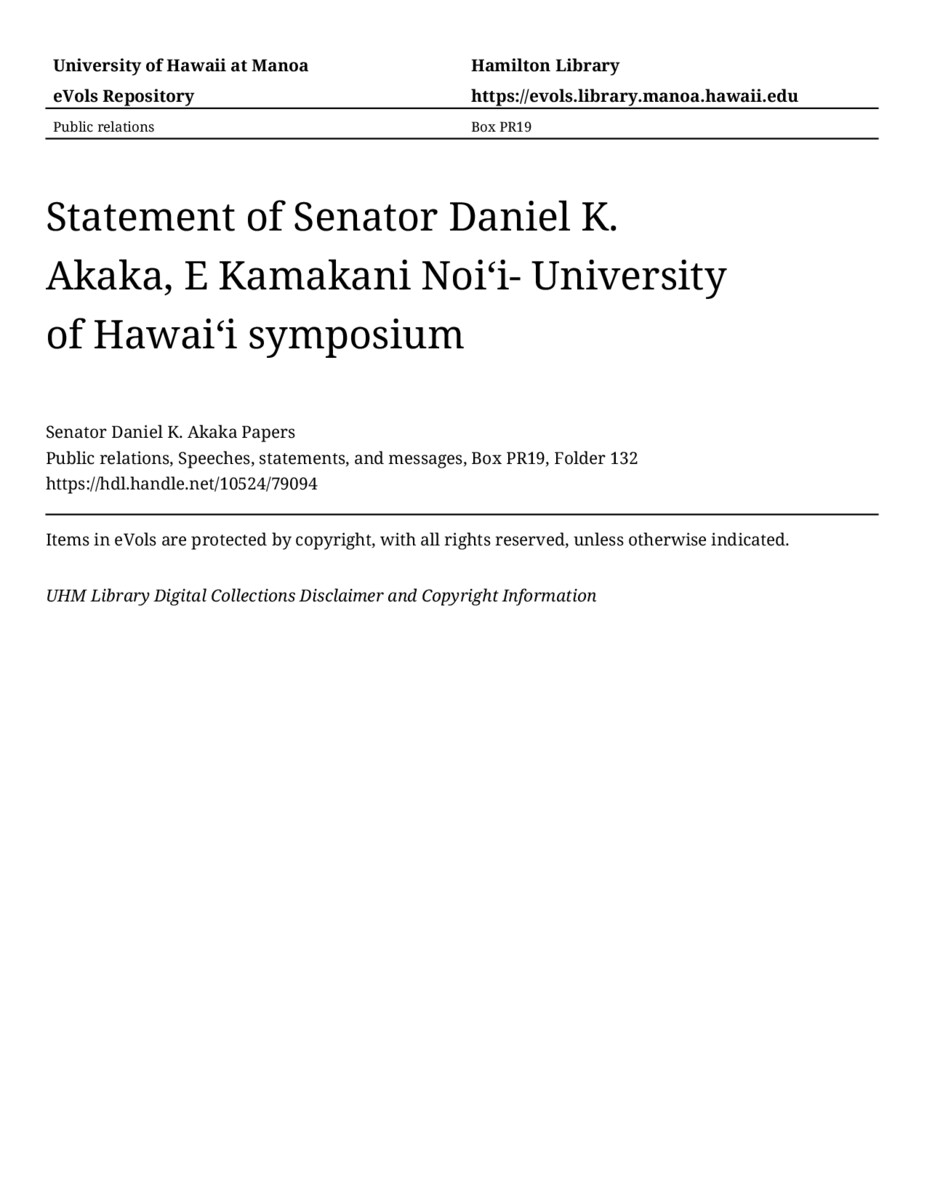 - Statement of Senator Daniel K. Akaka, E Kamakani Noiʻi- University of Hawaiʻi symposium
