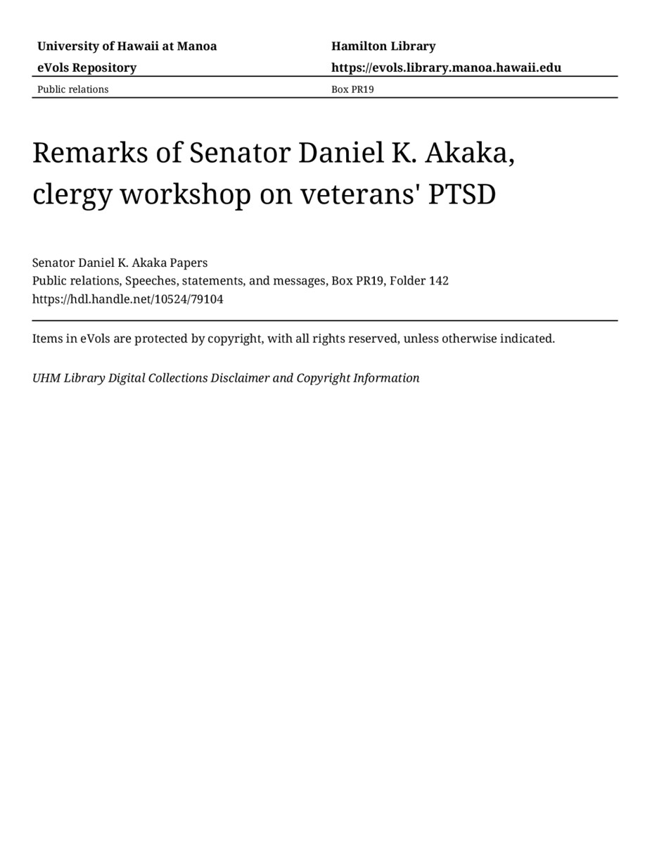 - Remarks of Senator Daniel K. Akaka, clergy workshop on veterans' PTSD