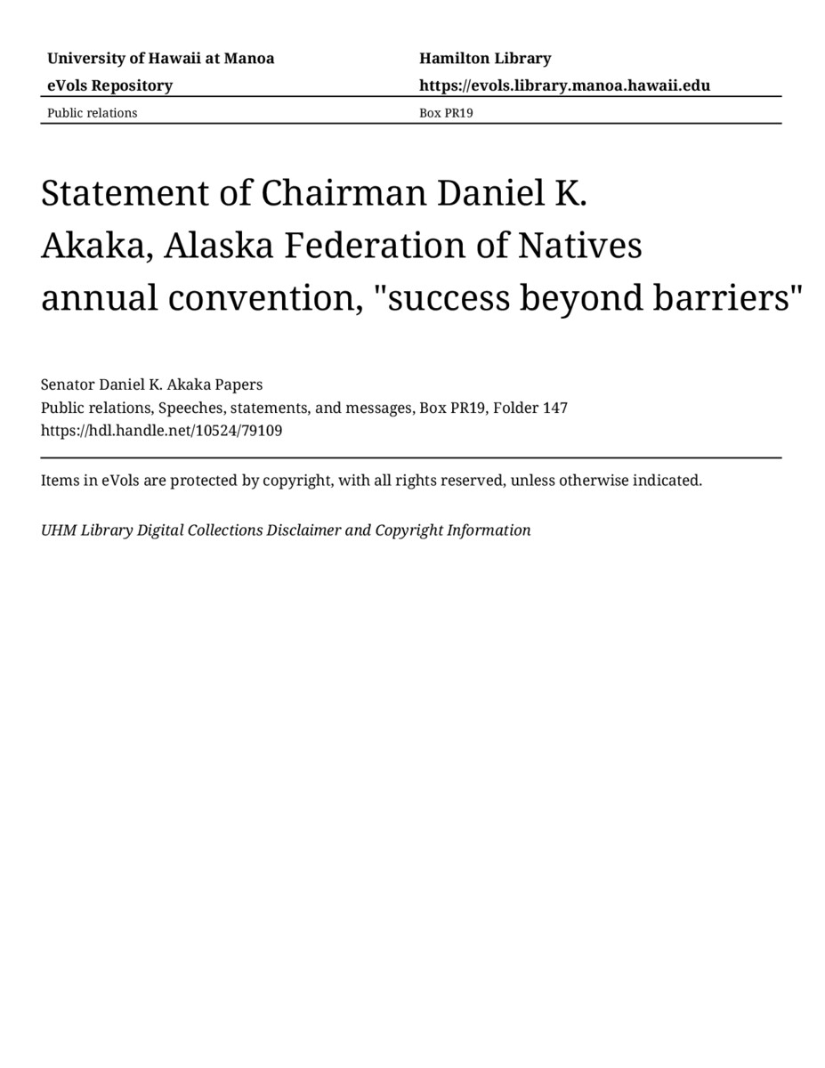 Statement of Chairman Daniel K. Akaka, Alaska Federation of Natives annual convention, "success beyond barriers", October 19, 2012, MANUSCRIPT-HCPC00010, Public relations, Speeches, statements, and messages, Box PR19, Folder 147, Senator Daniel K. Akaka Papers, Hawaiʻi Congressional Papers Collection, University of Hawaiʻi at Mānoa Library, Honolulu, HI. https://congressarchives.org/catalog/10524_79109 (accessed March 19, 2026).