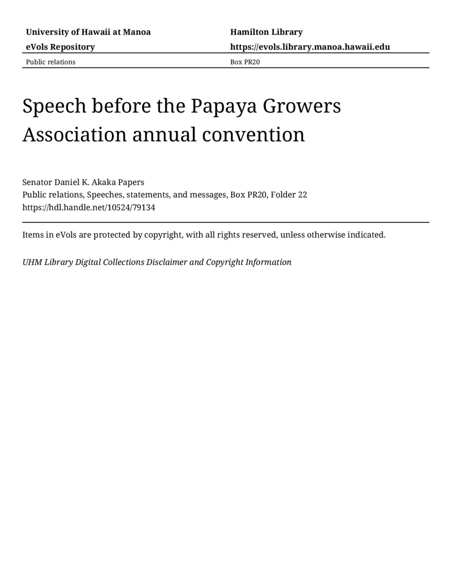 Speech before the Papaya Growers Association annual convention, September 28, 1984, MANUSCRIPT-HCPC00010, Public relations, Speeches, statements, and messages, Box PR20, Folder 22, Senator Daniel K. Akaka Papers, Hawaiʻi Congressional Papers Collection, University of Hawaiʻi at Mānoa Library, Honolulu, HI. https://congressarchives.org/catalog/10524_79134 (accessed March 21, 2026).