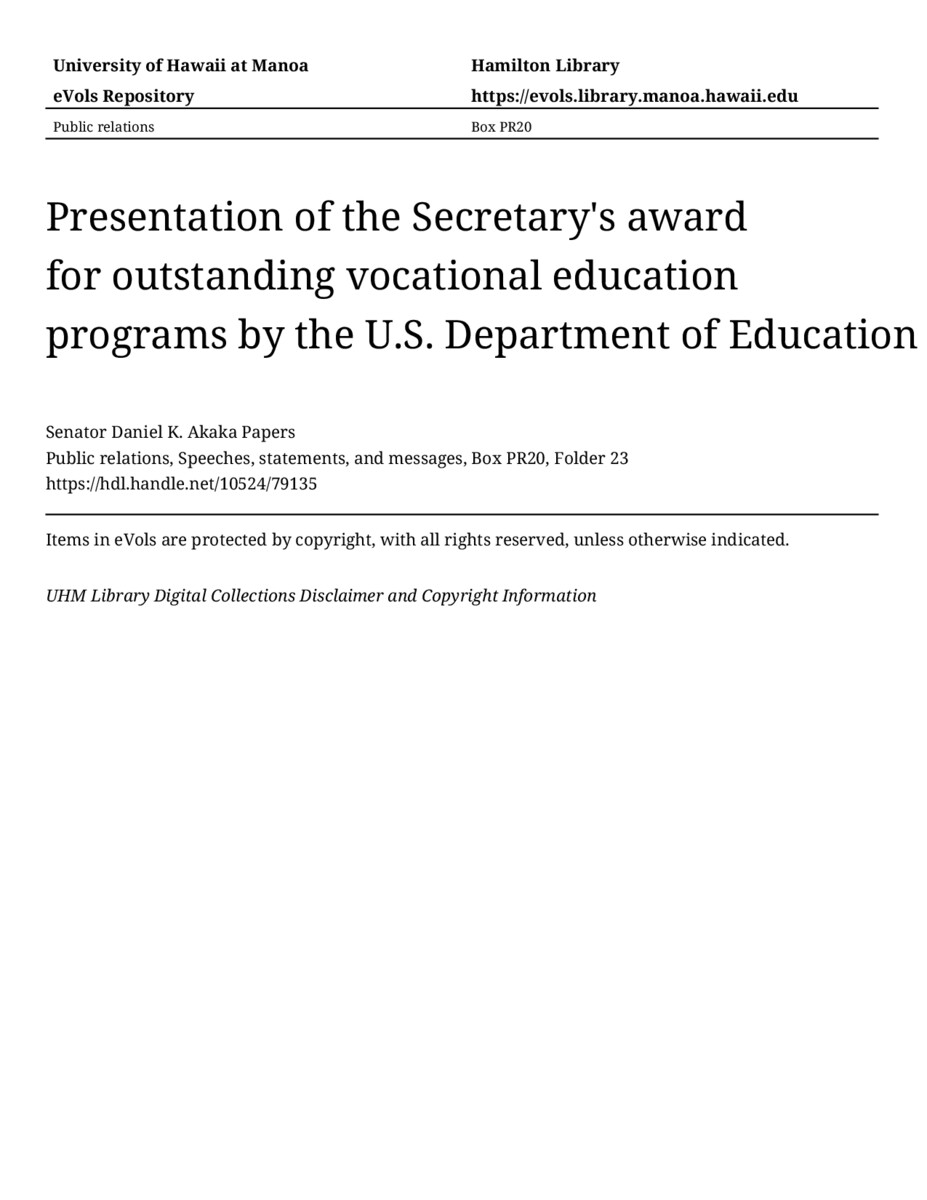 Presentation of the Secretary's award for outstanding vocational education programs by the U.S. Department of Education, October 20, 1984, MANUSCRIPT-HCPC00010, Public relations, Speeches, statements, and messages, Box PR20, Folder 23, Senator Daniel K. Akaka Papers, Hawaiʻi Congressional Papers Collection, University of Hawaiʻi at Mānoa Library, Honolulu, HI. https://congressarchives.org/catalog/10524_79135 (accessed March 18, 2026).