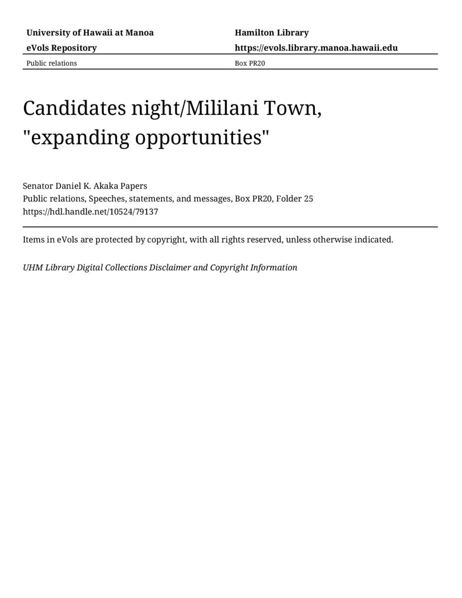 Candidates night/Mililani Town, "expanding opportunities", October 30, 1984, MANUSCRIPT-HCPC00010, Public relations, Speeches, statements, and messages, Box PR20, Folder 25, Senator Daniel K. Akaka Papers, Hawaiʻi Congressional Papers Collection, University of Hawaiʻi at Mānoa Library, Honolulu, HI. https://congressarchives.org/catalog/10524_79137 (accessed March 20, 2026).