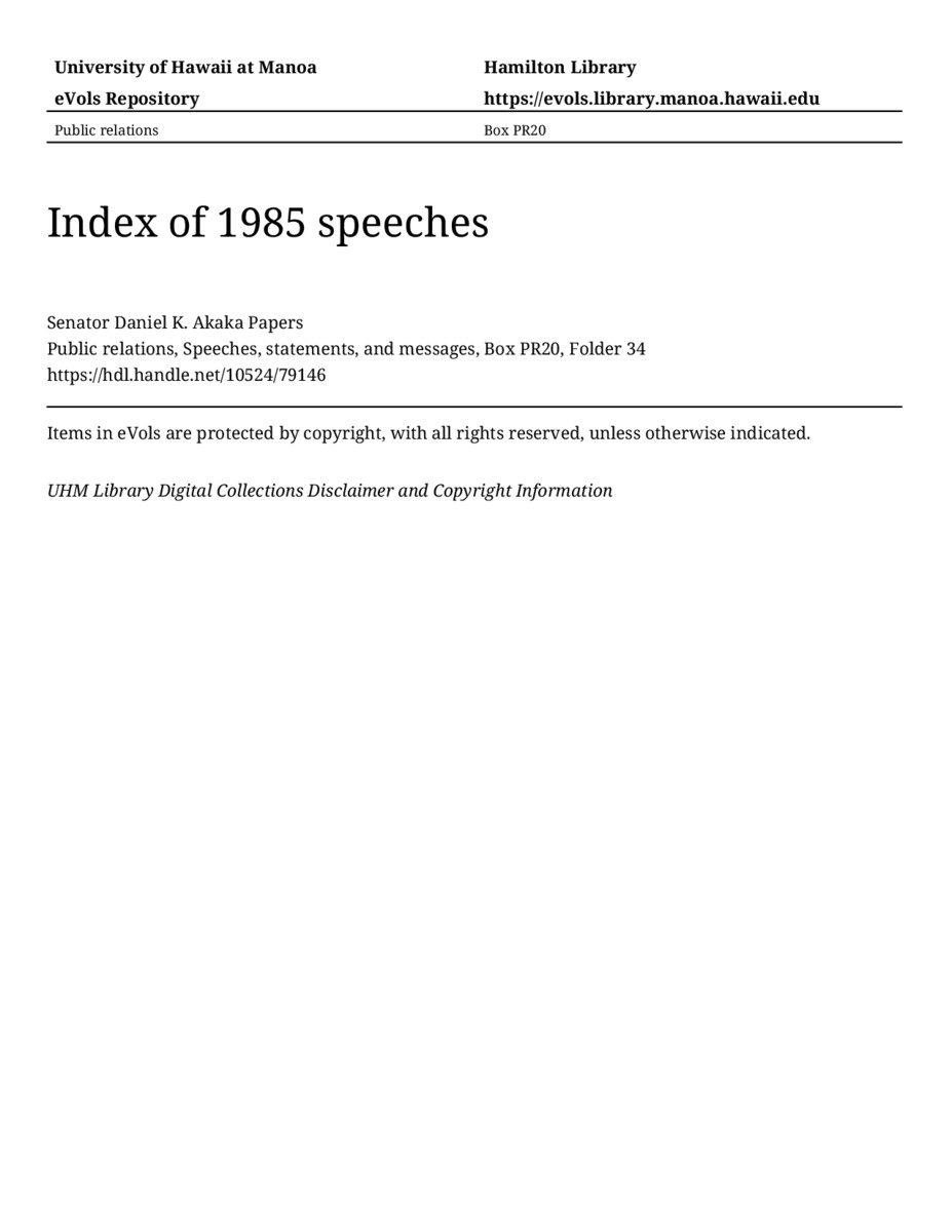 Index of 1985 speeches, April 8, 1985-December 16, 1985, MANUSCRIPT-HCPC00010, Public relations, Speeches, statements, and messages, Box PR20, Folder 34, Senator Daniel K. Akaka Papers, Hawaiʻi Congressional Papers Collection, University of Hawaiʻi at Mānoa Library, Honolulu, HI. https://congressarchives.org/catalog/10524_79146 (accessed March 20, 2026).