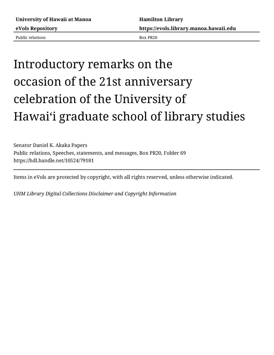 Introductory remarks on the occasion of the 21st anniversary celebration of the University of Hawaiʻi graduate school of library studies, October 18, 1986, MANUSCRIPT-HCPC00010, Public relations, Speeches, statements, and messages, Box PR20, Folder 69, Senator Daniel K. Akaka Papers, Hawaiʻi Congressional Papers Collection, University of Hawaiʻi at Mānoa Library, Honolulu, HI. https://congressarchives.org/catalog/10524_79181 (accessed March 20, 2026).