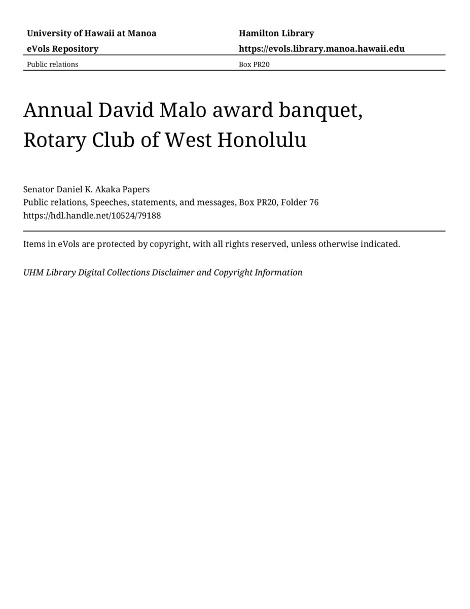 Annual David Malo award banquet, Rotary Club of West Honolulu, October 10, 1987, MANUSCRIPT-HCPC00010, Public relations, Speeches, statements, and messages, Box PR20, Folder 76, Senator Daniel K. Akaka Papers, Hawaiʻi Congressional Papers Collection, University of Hawaiʻi at Mānoa Library, Honolulu, HI. https://congressarchives.org/catalog/10524_79188 (accessed March 20, 2026).