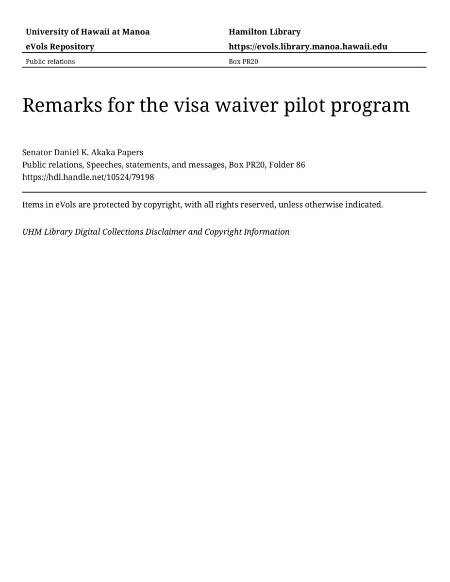 Remarks for the visa waiver pilot program, December 14, 1988, MANUSCRIPT-HCPC00010, Public relations, Speeches, statements, and messages, Box PR20, Folder 86, Senator Daniel K. Akaka Papers, Hawaiʻi Congressional Papers Collection, University of Hawaiʻi at Mānoa Library, Honolulu, HI. https://congressarchives.org/catalog/10524_79198 (accessed March 17, 2026).