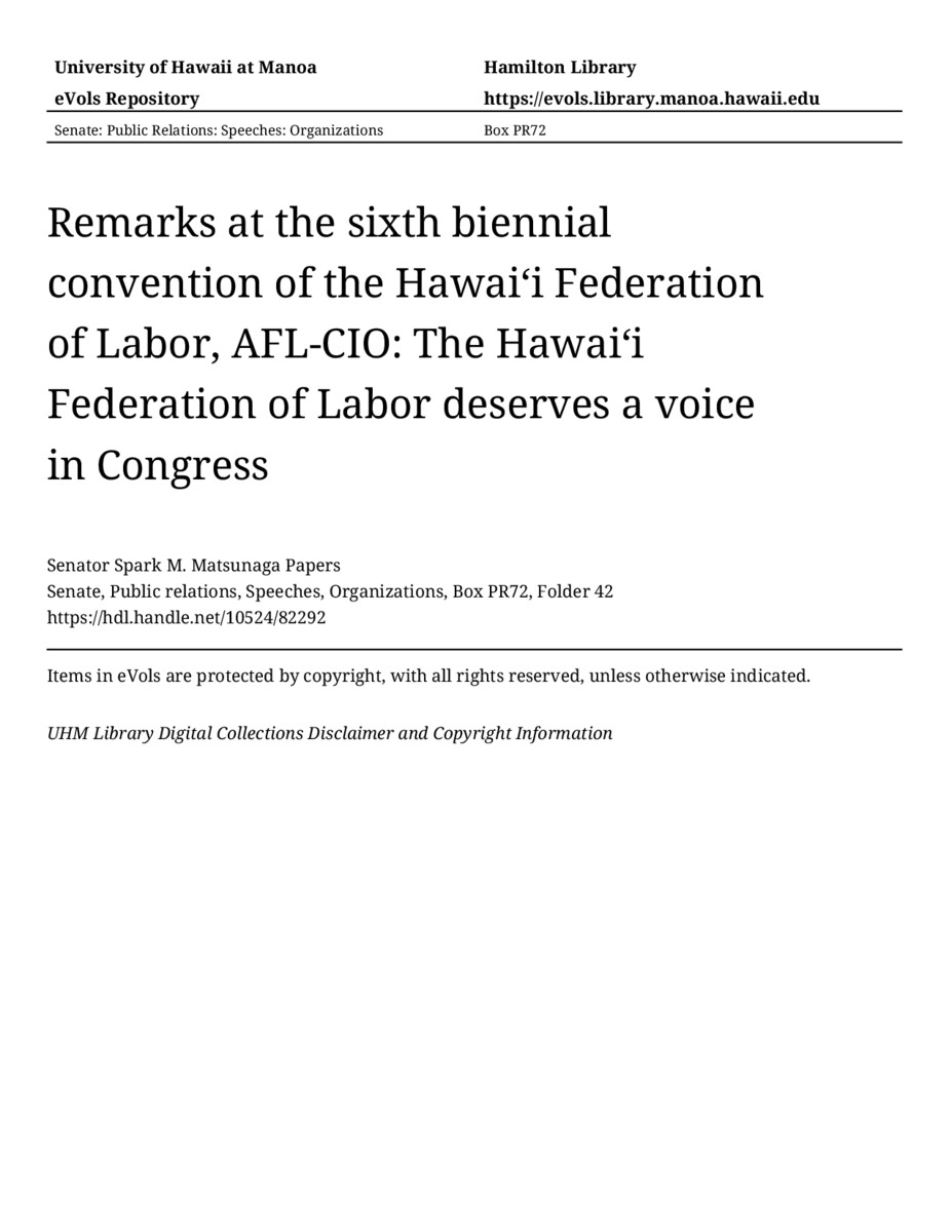 Remarks at the sixth biennial convention of the Hawaiʻi Federation of Labor, AFL-CIO: The Hawaiʻi Federation of Labor deserves a voice in Congress, 09/13/75, Senate, Public relations, Speeches, Organizations, Box PR72, Folder 42, Senator Spark M. Matsunaga Papers, Hawaiʻi Congressional Papers Collection, University of Hawaiʻi at Mānoa Library, Honolulu, HI. https://congressarchives.org/catalog/10524_82292 (accessed March 19, 2026).