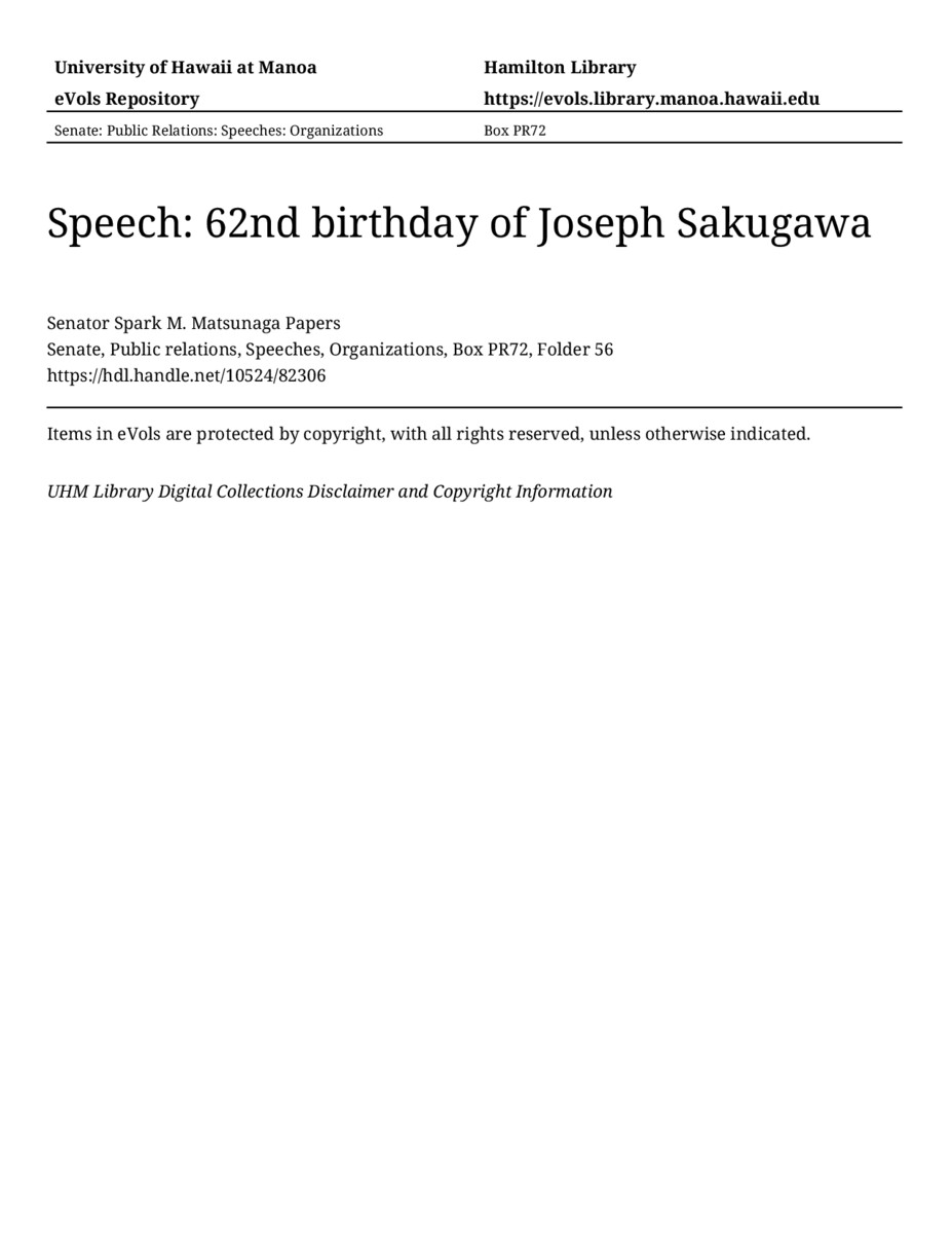 Speech: 62nd birthday of Joseph Sakugawa, 11/30/75, Senate, Public relations, Speeches, Organizations, Box PR72, Folder 56, Senator Spark M. Matsunaga Papers, Hawaiʻi Congressional Papers Collection, University of Hawaiʻi at Mānoa Library, Honolulu, HI. https://congressarchives.org/catalog/10524_82306 (accessed March 20, 2026).