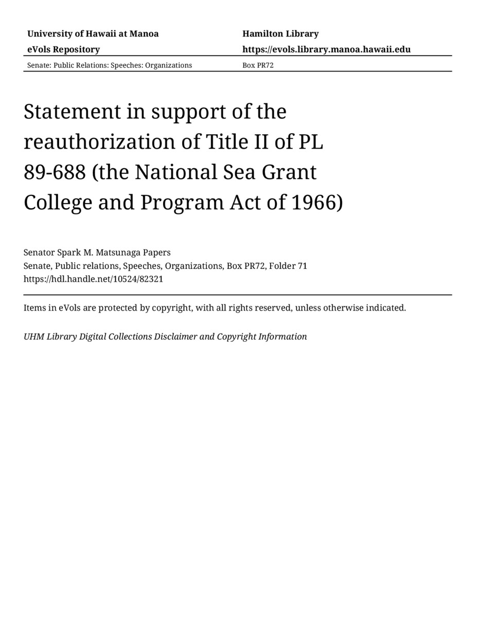 - Statement in support of the reauthorization of Title II of PL 89-688 (the National Sea Grant College and Program Act of 1966)