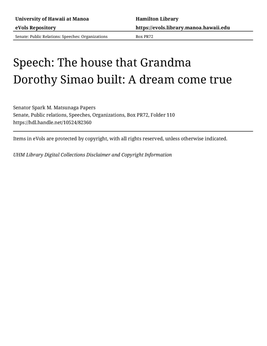 - Speech: The house that Grandma Dorothy Simao built: A dream come true