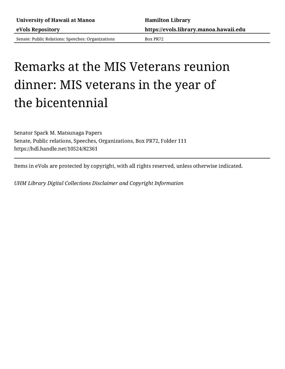 - Remarks at the MIS Veterans reunion dinner: MIS veterans in the year of the bicentennial