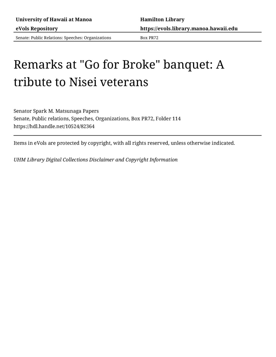 Remarks at "Go for Broke" banquet: A tribute to Nisei veterans, 07/28/76, Senate, Public relations, Speeches, Organizations, Box PR72, Folder 114, Senator Spark M. Matsunaga Papers, Hawaiʻi Congressional Papers Collection, University of Hawaiʻi at Mānoa Library, Honolulu, HI. https://congressarchives.org/catalog/10524_82364 (accessed March 21, 2026).