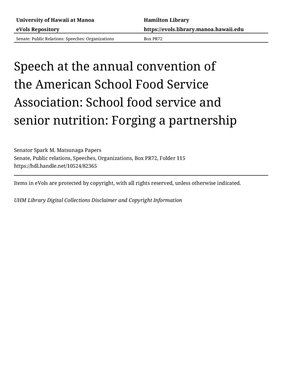 Speech at the annual convention of the American School Food Service Association: School food service and senior nutrition: Forging a partnership, 08/01/76, Senate, Public relations, Speeches, Organizations, Box PR72, Folder 115, Senator Spark M. Matsunaga Papers, Hawaiʻi Congressional Papers Collection, University of Hawaiʻi at Mānoa Library, Honolulu, HI. https://congressarchives.org/catalog/10524_82365 (accessed March 20, 2026).