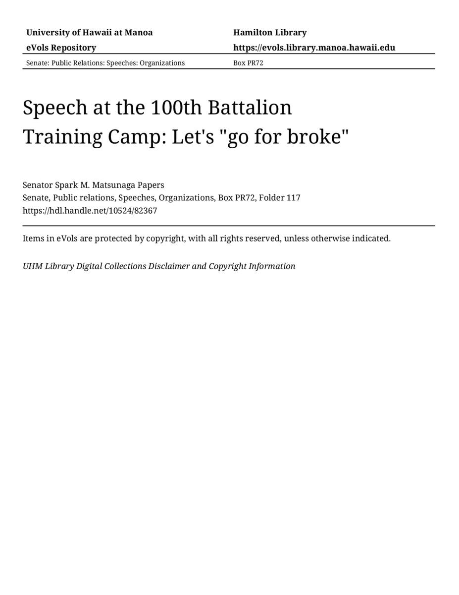 - Speech at the 100th Battalion Training Camp: Let's "go for broke"