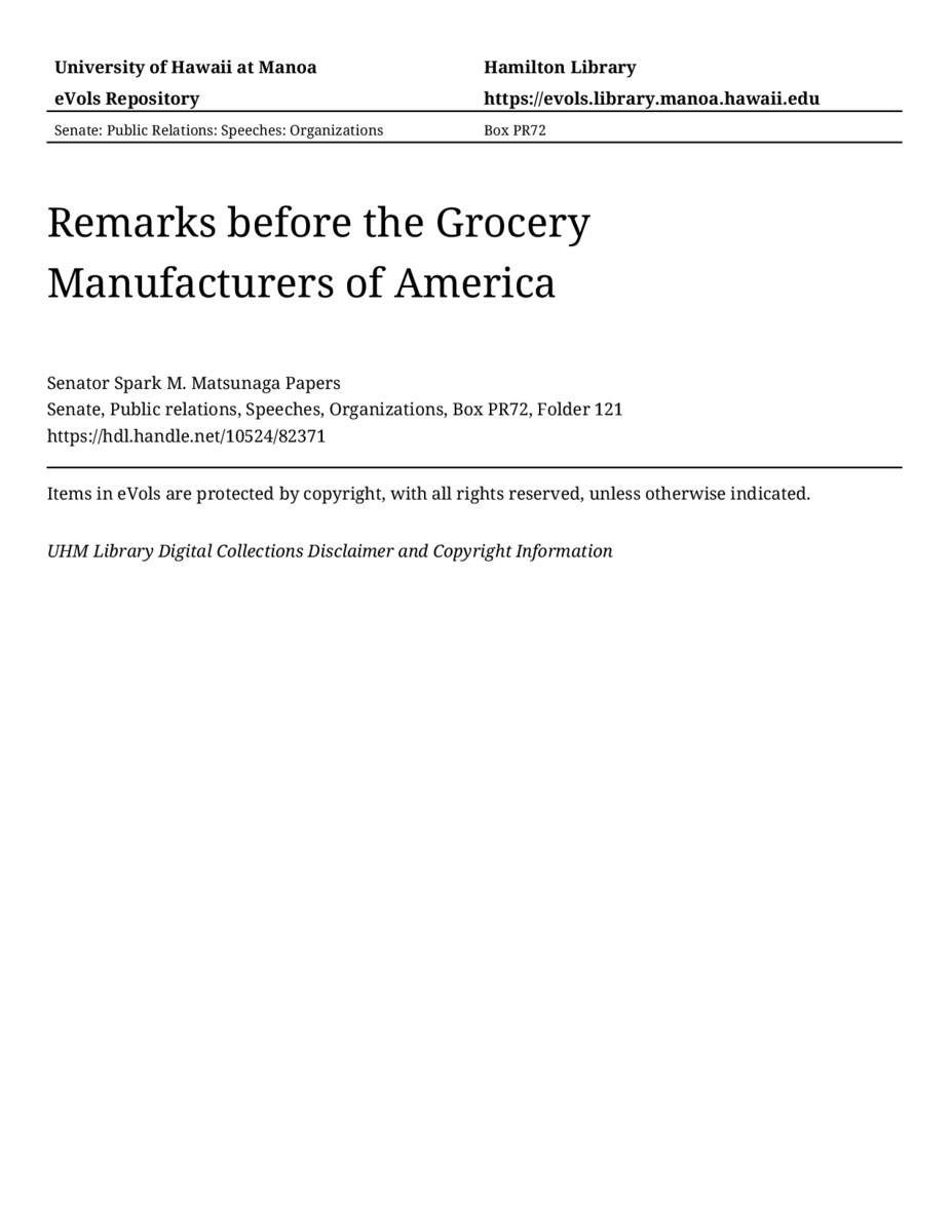 Remarks before the Grocery Manufacturers of America, 08/10/76, Senate, Public relations, Speeches, Organizations, Box PR72, Folder 121, Senator Spark M. Matsunaga Papers, Hawaiʻi Congressional Papers Collection, University of Hawaiʻi at Mānoa Library, Honolulu, HI. https://congressarchives.org/catalog/10524_82371 (accessed March 21, 2026).