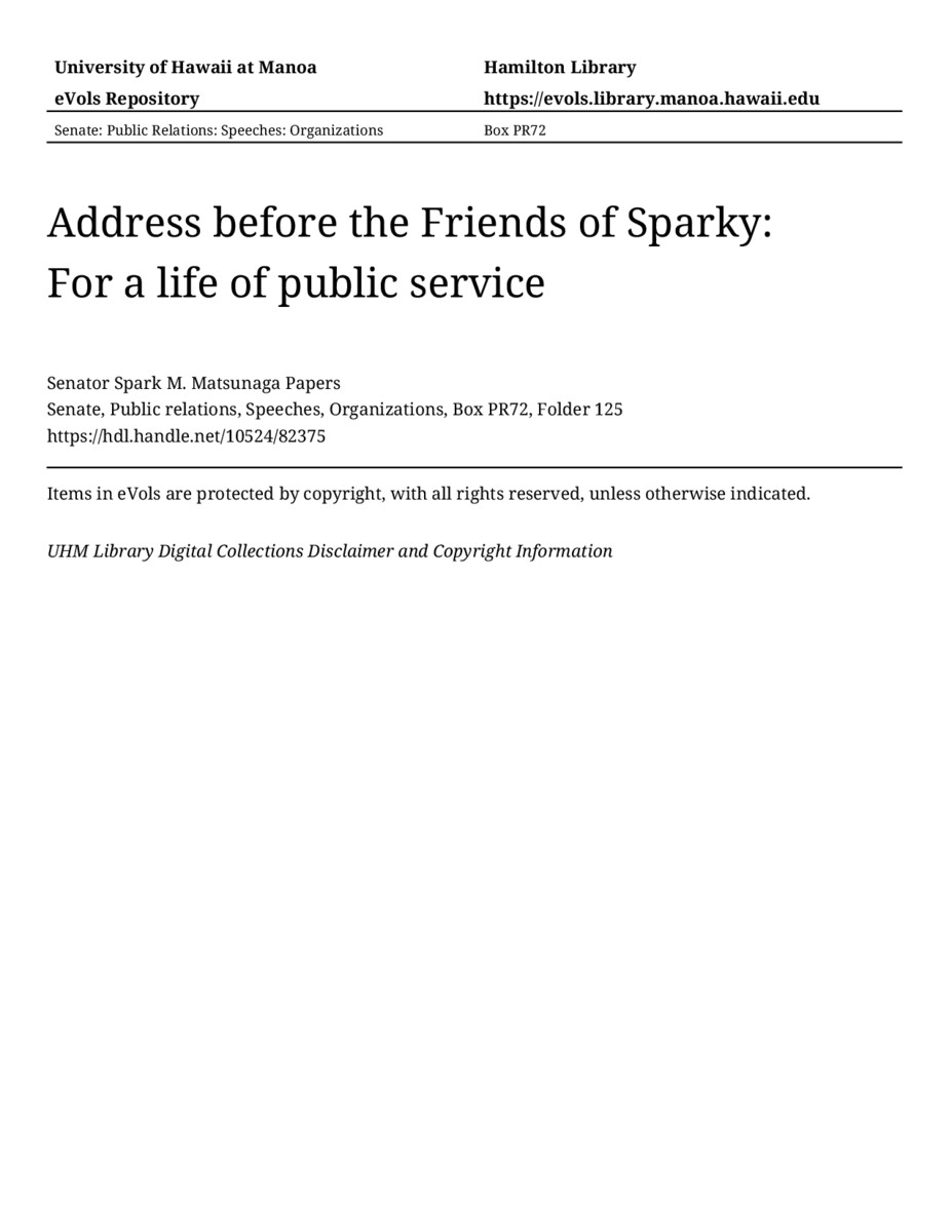 - Senate, Public relations, Speeches, Organizations, Box PR72, Folder 125