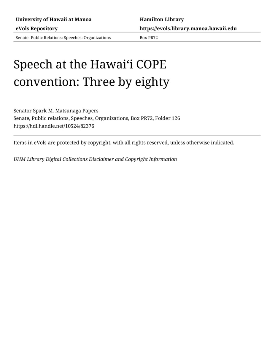 Speech at the Hawaiʻi COPE convention: Three by eighty, 08/21/76, Senate, Public relations, Speeches, Organizations, Box PR72, Folder 126, Senator Spark M. Matsunaga Papers, Hawaiʻi Congressional Papers Collection, University of Hawaiʻi at Mānoa Library, Honolulu, HI. https://congressarchives.org/catalog/10524_82376 (accessed March 21, 2026).