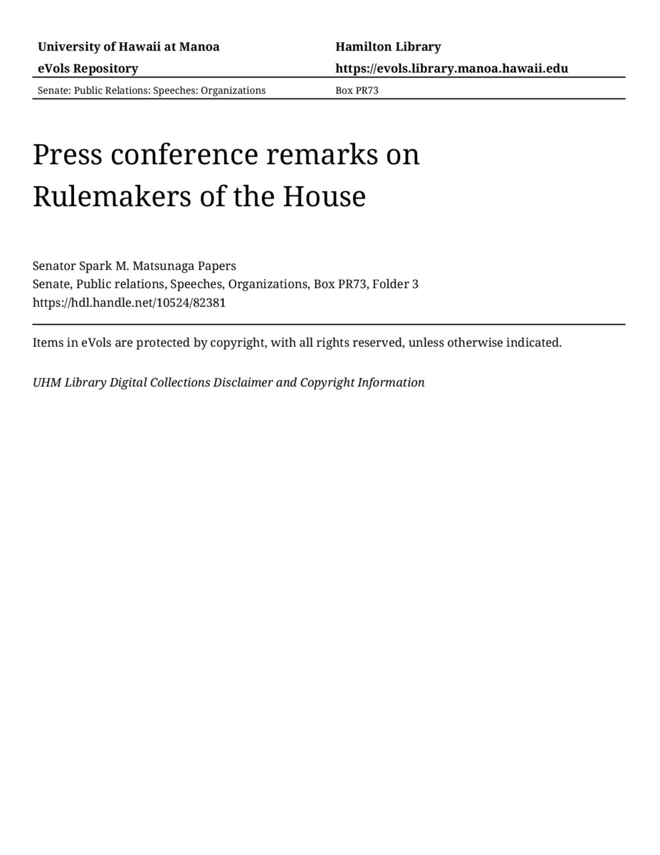 Press conference remarks on Rulemakers of the House, 09/08/76, Senate, Public relations, Speeches, Organizations, Box PR73, Folder 3, Senator Spark M. Matsunaga Papers, Hawaiʻi Congressional Papers Collection, University of Hawaiʻi at Mānoa Library, Honolulu, HI. https://congressarchives.org/catalog/10524_82381 (accessed March 19, 2026).