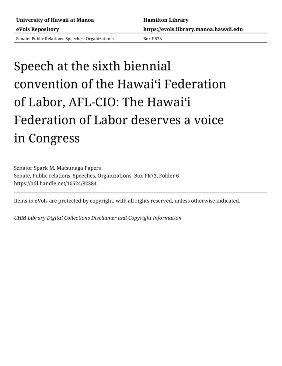 Speech at the sixth biennial convention of the Hawaiʻi Federation of Labor, AFL-CIO: The Hawaiʻi Federation of Labor deserves a voice in Congress, 09/13/76, Senate, Public relations, Speeches, Organizations, Box PR73, Folder 6, Senator Spark M. Matsunaga Papers, Hawaiʻi Congressional Papers Collection, University of Hawaiʻi at Mānoa Library, Honolulu, HI. https://congressarchives.org/catalog/10524_82384 (accessed March 20, 2026).