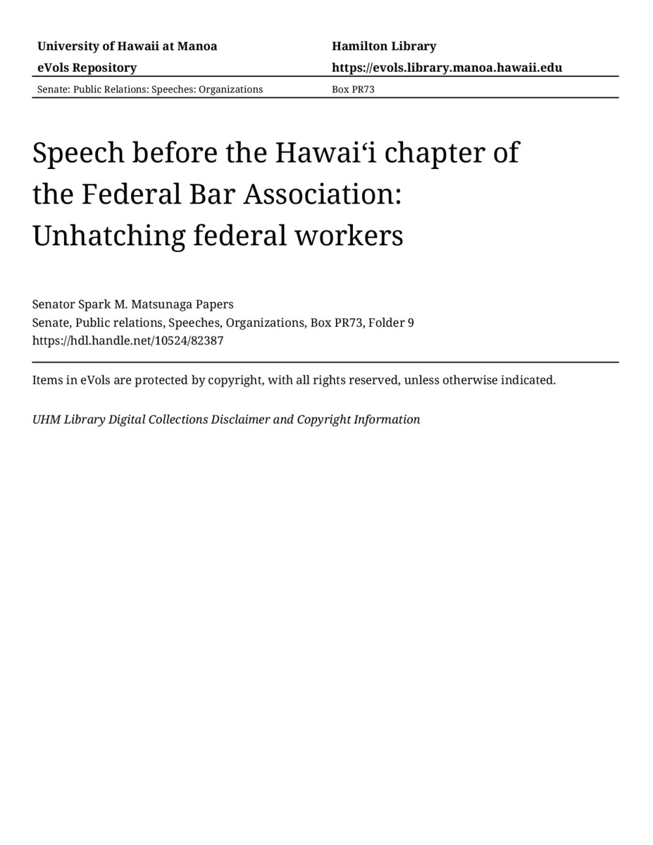 - Speech before the Hawaiʻi chapter of the Federal Bar Association: Unhatching federal workers