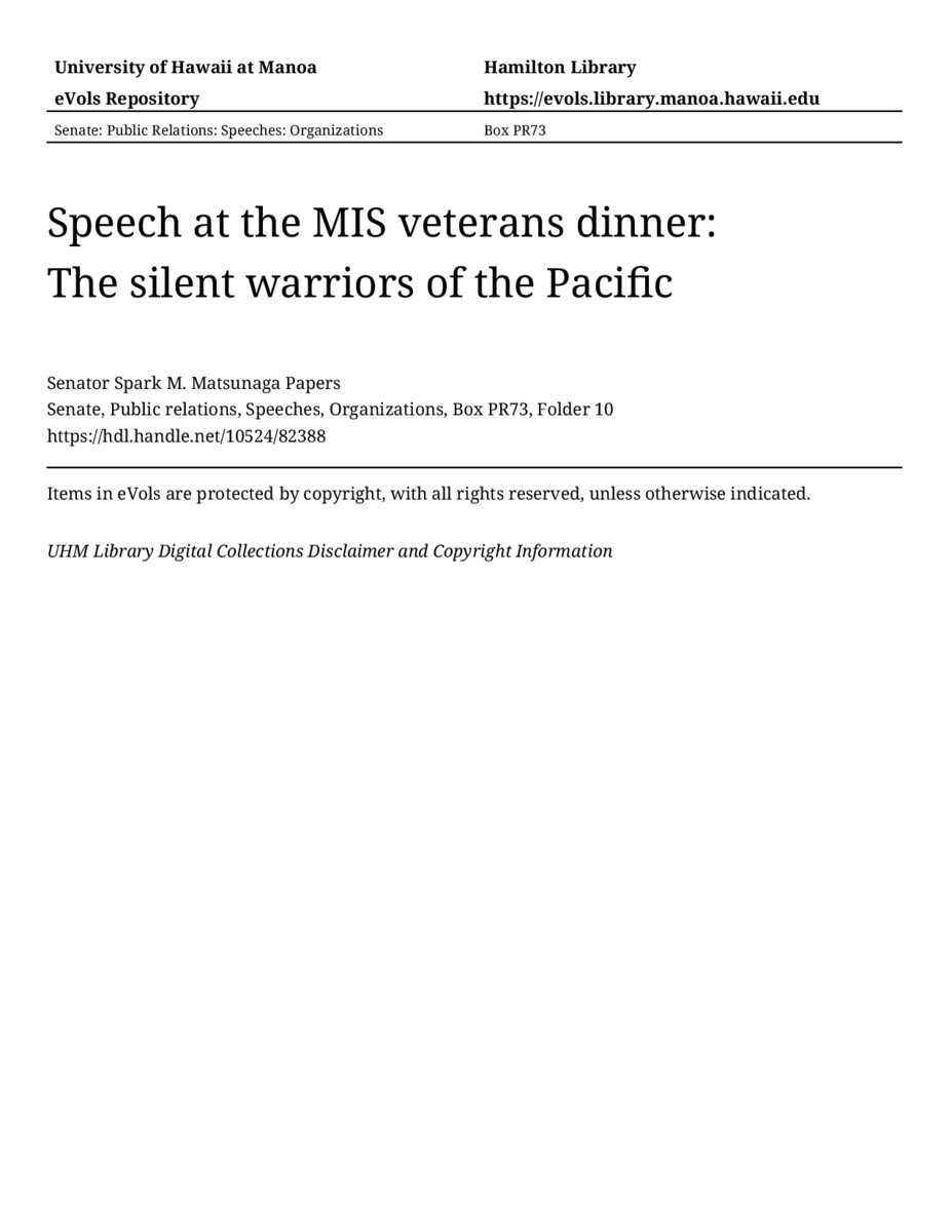 - Speech at the MIS veterans dinner: The silent warriors of the Pacific