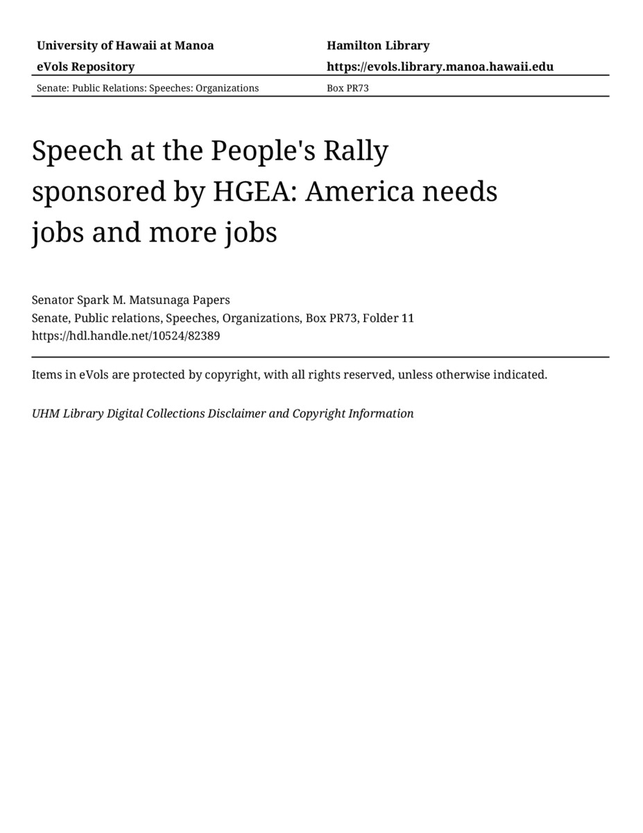 - Speech at the People's Rally sponsored by HGEA: America needs jobs and more jobs
