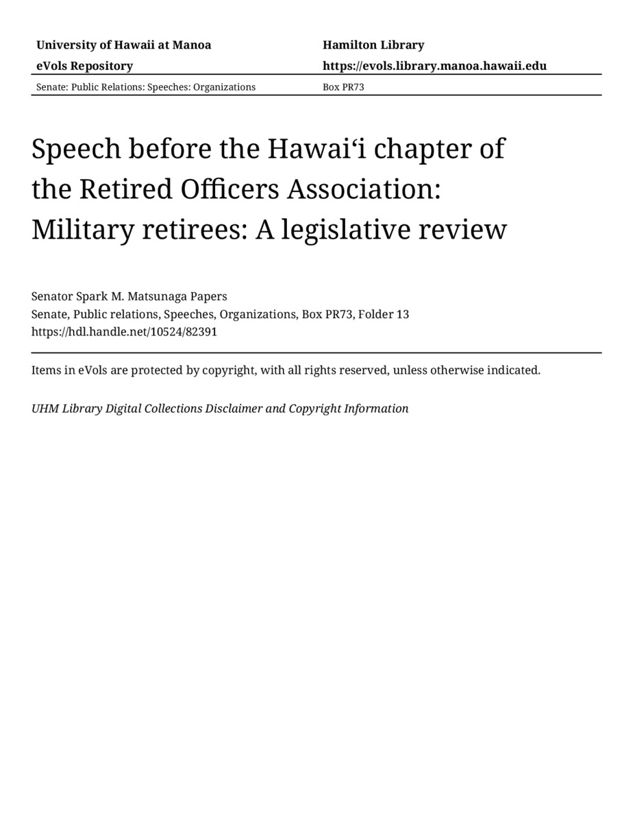 - Speech before the Hawaiʻi chapter of the Retired Officers Association: Military retirees: A legislative review