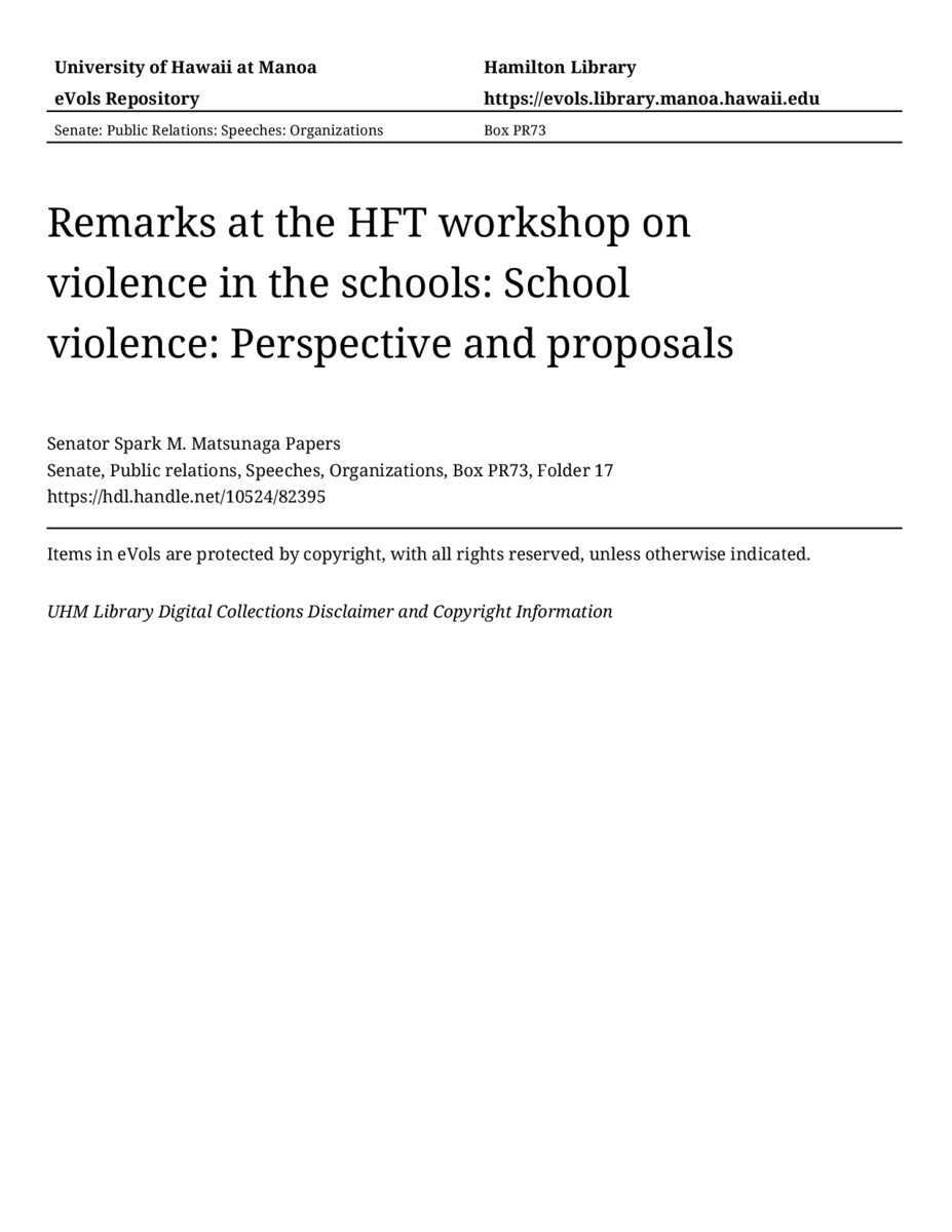 - Remarks at the HFT workshop on violence in the schools: School violence: Perspective and proposals
