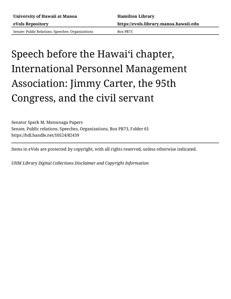 - Speech before the Hawaiʻi chapter, International Personnel Management Association: Jimmy Carter, the 95th Congress, and the civil servant