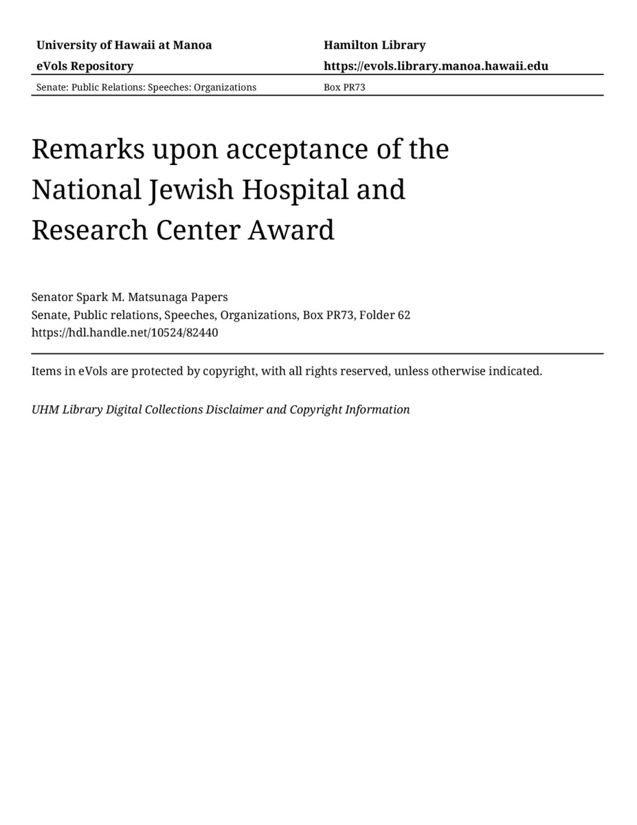 Remarks upon acceptance of the National Jewish Hospital and Research Center Award