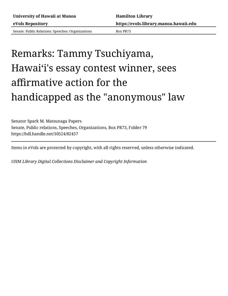 - Remarks: Tammy Tsuchiyama, Hawaiʻi's essay contest winner, sees affirmative action for the handicapped as the "anonymous" law
