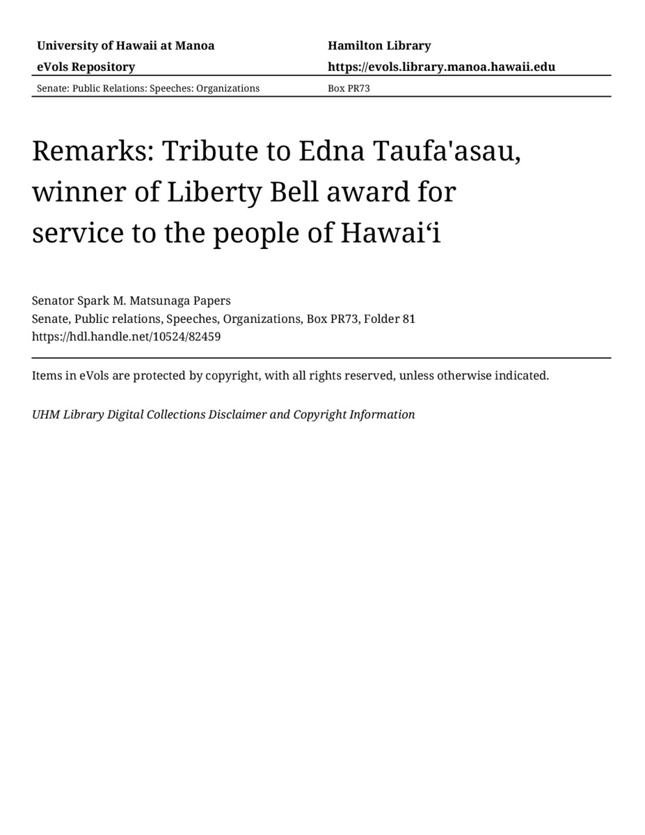 - Remarks: Tribute to Edna Taufa'asau, winner of Liberty Bell award for service to the people of Hawaiʻi