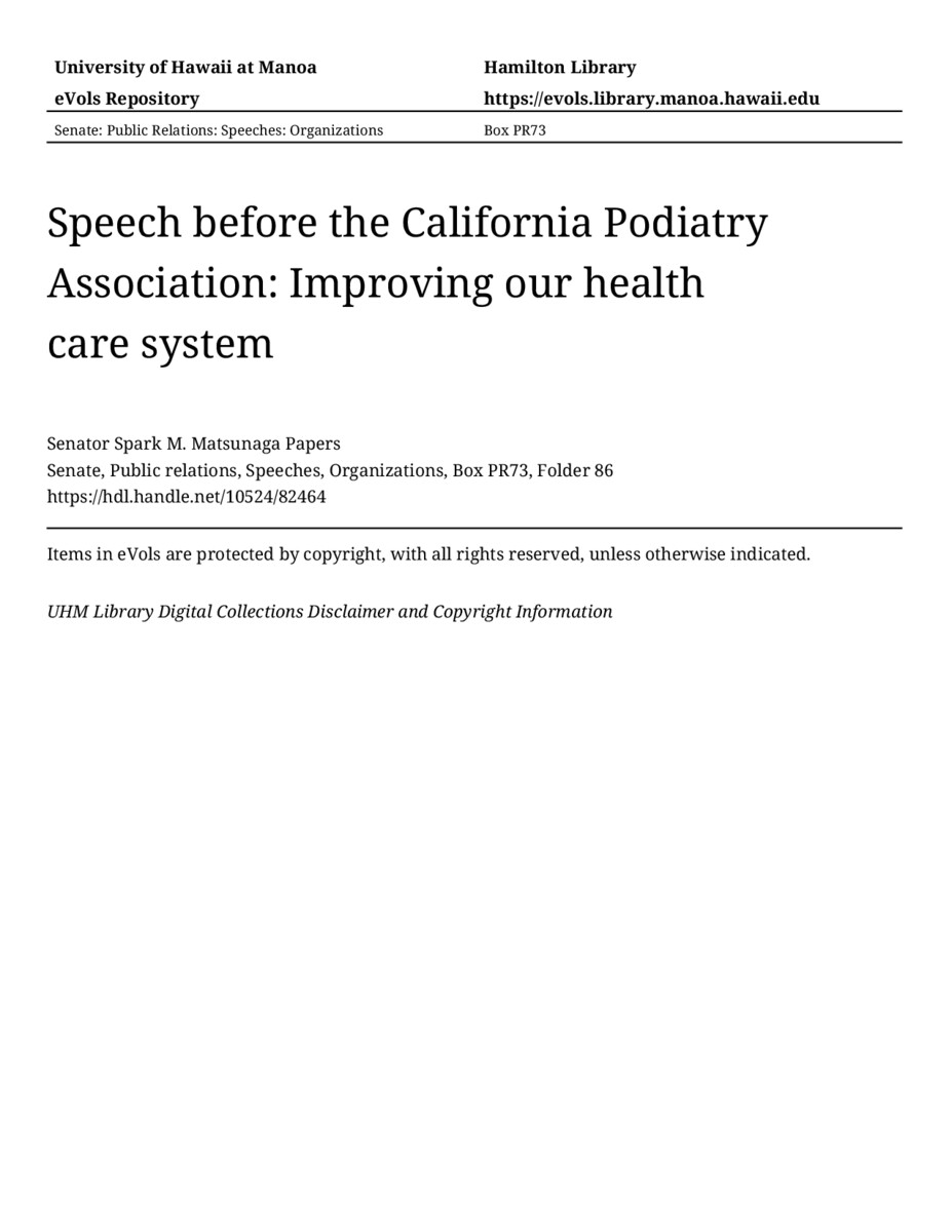 - Speech before the California Podiatry Association: Improving our health care system