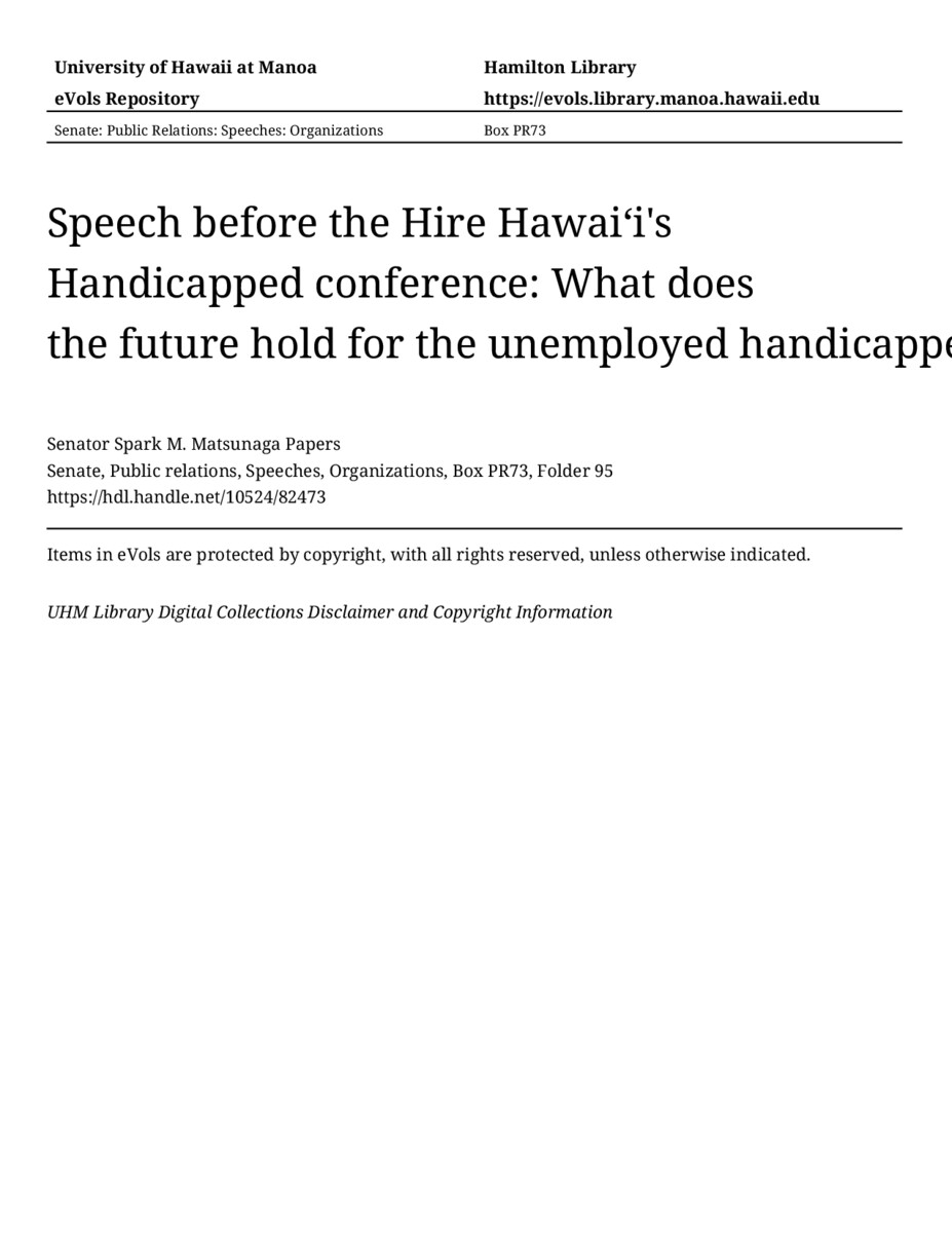 - Speech before the Hire Hawaiʻi's Handicapped conference: What does the future hold for the unemployed handicapped?