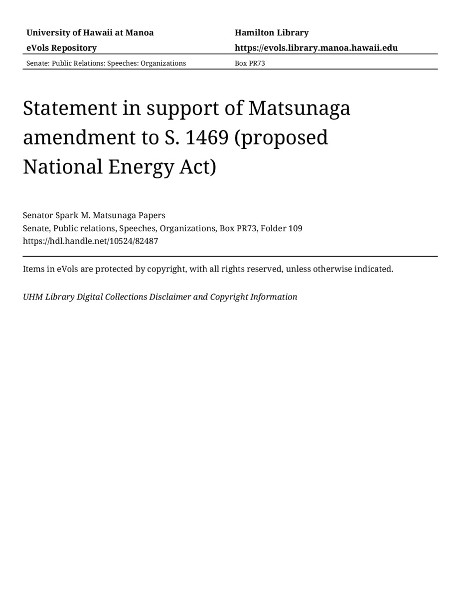 - Statement in support of Matsunaga amendment to S. 1469 (proposed National Energy Act)