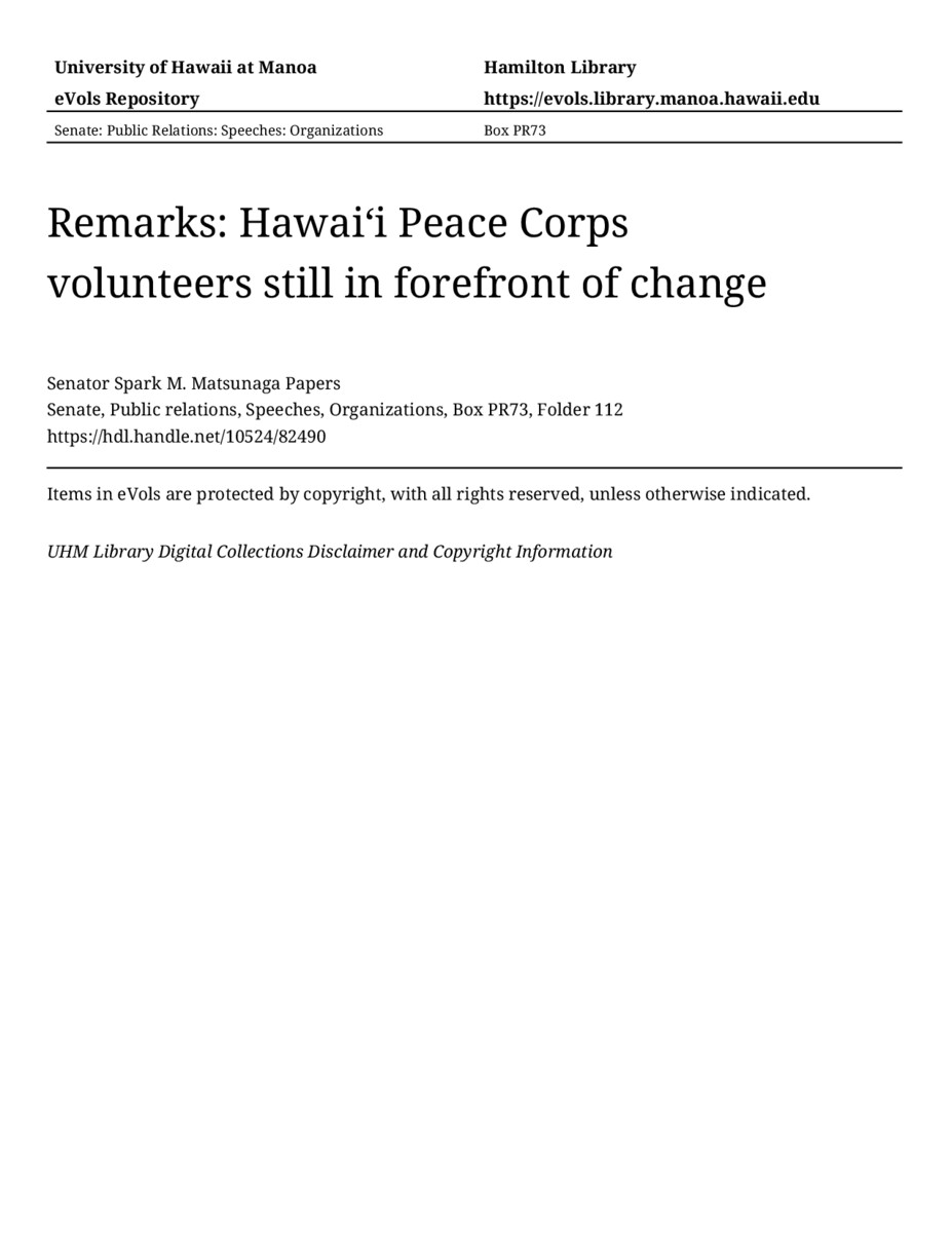 - Remarks: Hawaiʻi Peace Corps volunteers still in forefront of change
