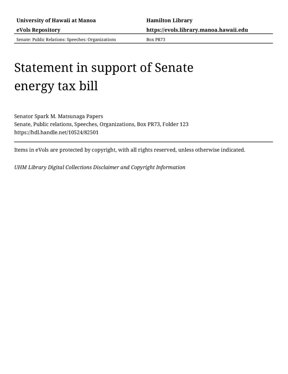 Statement in support of Senate energy tax bill, 10/31/77, Senate, Public relations, Speeches, Organizations, Box PR73, Folder 123, Senator Spark M. Matsunaga Papers, Hawaiʻi Congressional Papers Collection, University of Hawaiʻi at Mānoa Library, Honolulu, HI. https://congressarchives.org/catalog/10524_82501 (accessed March 18, 2026).