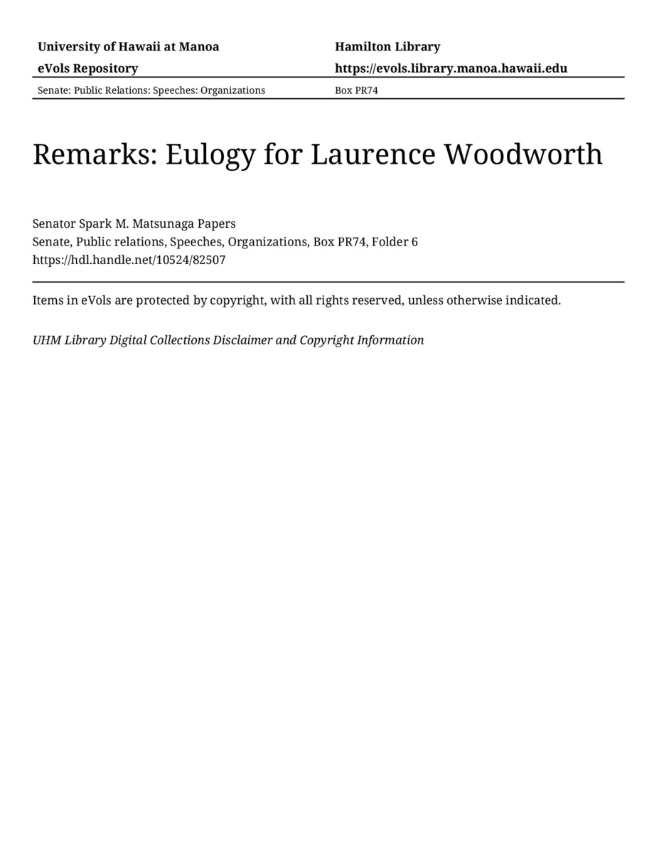 Remarks: Eulogy for Laurence Woodworth, 12/15/77, Senate, Public relations, Speeches, Organizations, Box PR74, Folder 6, Senator Spark M. Matsunaga Papers, Hawaiʻi Congressional Papers Collection, University of Hawaiʻi at Mānoa Library, Honolulu, HI. https://congressarchives.org/catalog/10524_82507 (accessed March 20, 2026).