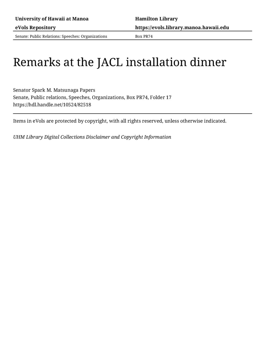 Remarks at the JACL installation dinner, 01/28/78, Senate, Public relations, Speeches, Organizations, Box PR74, Folder 17, Senator Spark M. Matsunaga Papers, Hawaiʻi Congressional Papers Collection, University of Hawaiʻi at Mānoa Library, Honolulu, HI. https://congressarchives.org/catalog/10524_82518 (accessed March 21, 2026).
