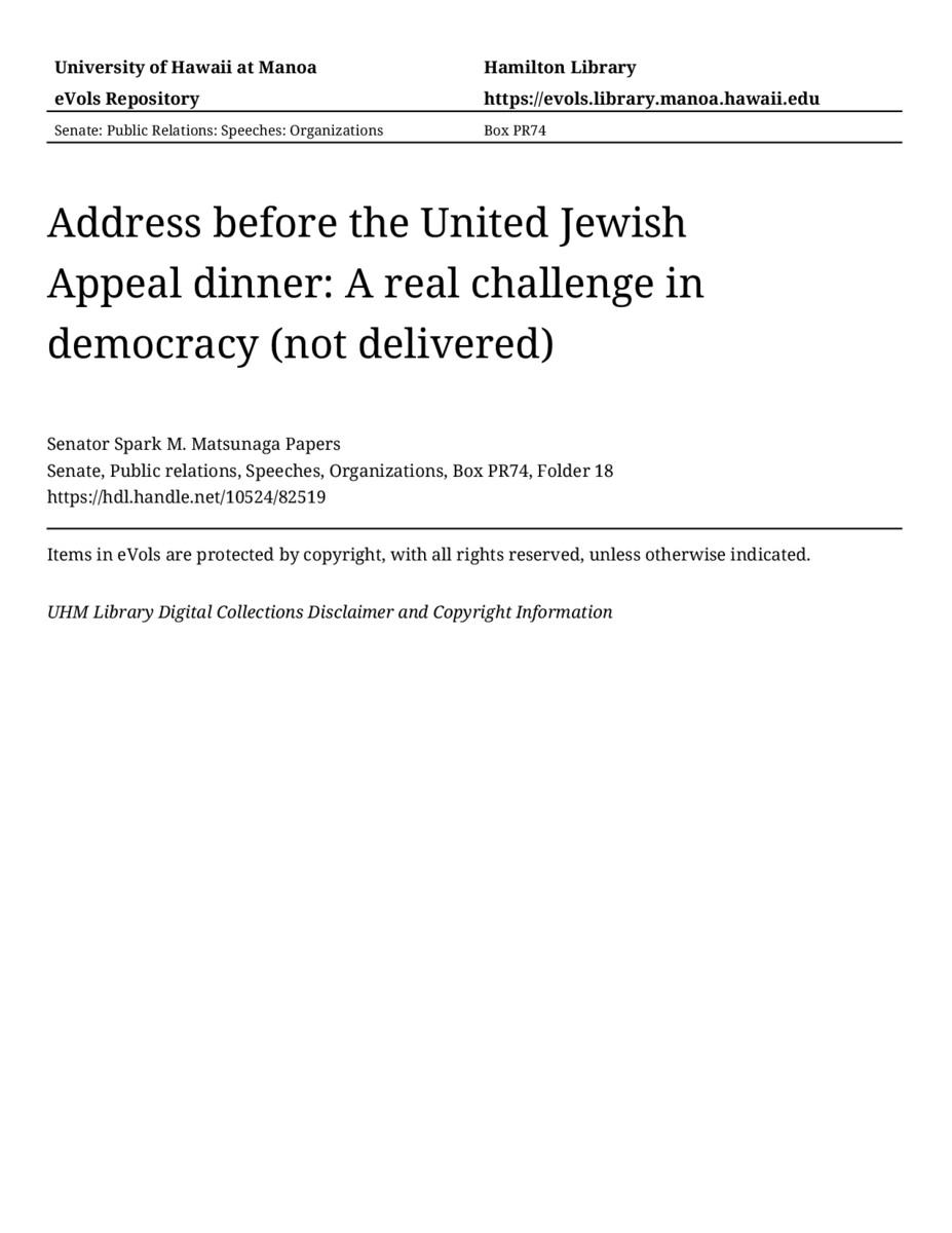 - Address before the United Jewish Appeal dinner: A real challenge in democracy (not delivered)