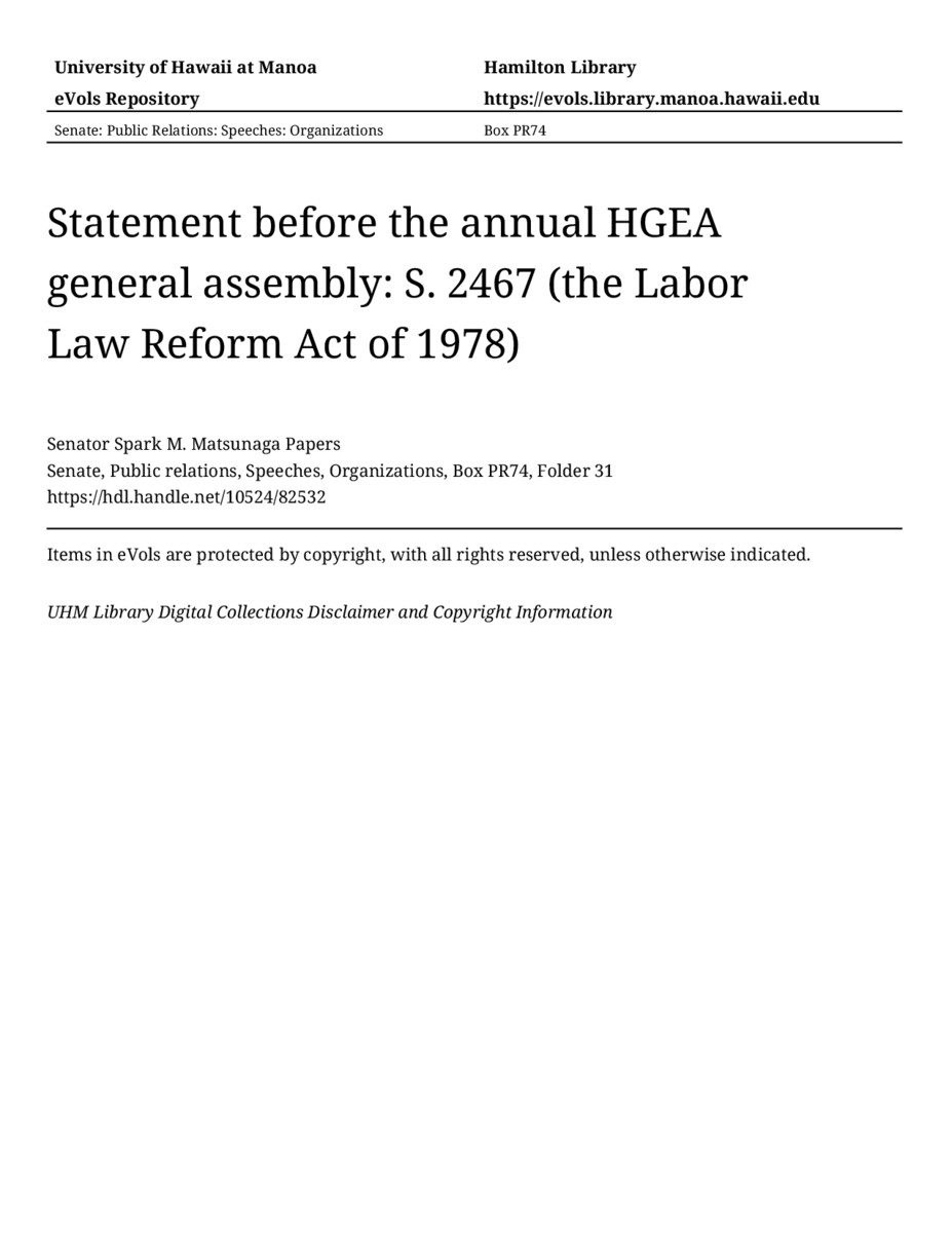 - Statement before the annual HGEA general assembly: S. 2467 (the Labor Law Reform Act of 1978)